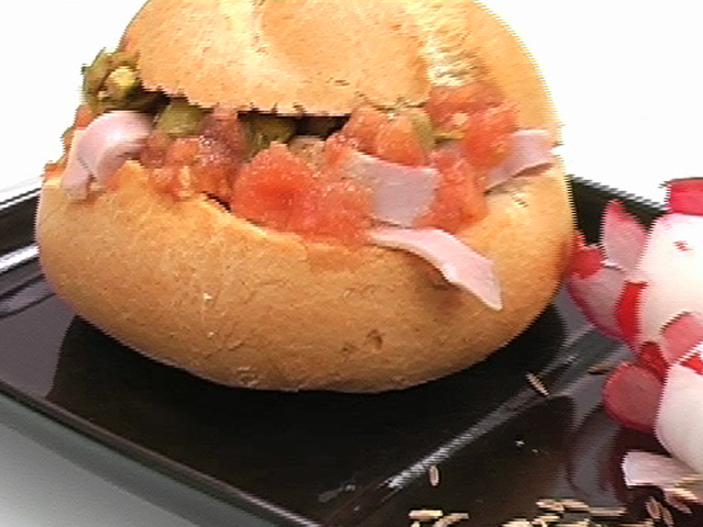 Сэндвич для любителей острых блюд.Состав:булочки — 3 штуки;колбаса — 4 кусочка;помидоры — 3 штуки;чеснок — 3 зубчика;небольшое количество оливок;оливковое масло, соль, перец, орегано, кумин — по вкусу. Язык: Русский